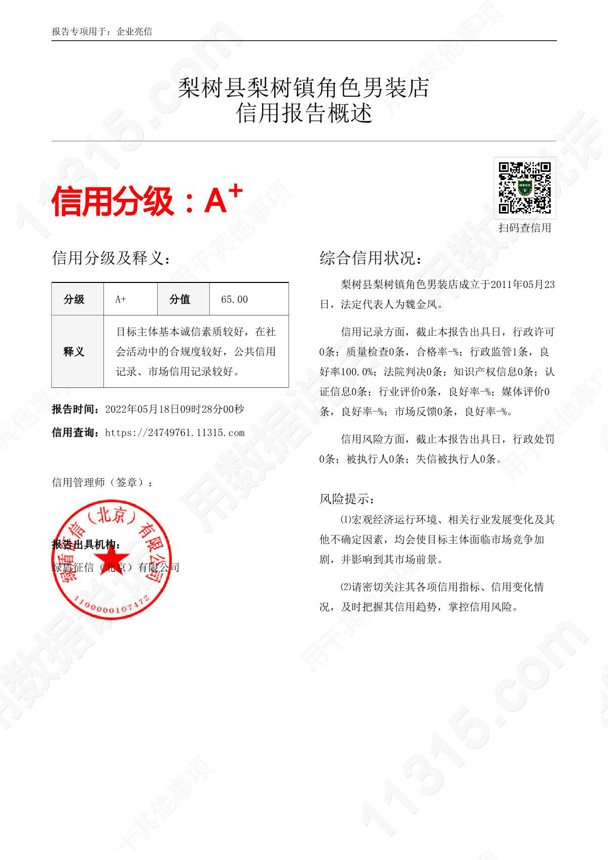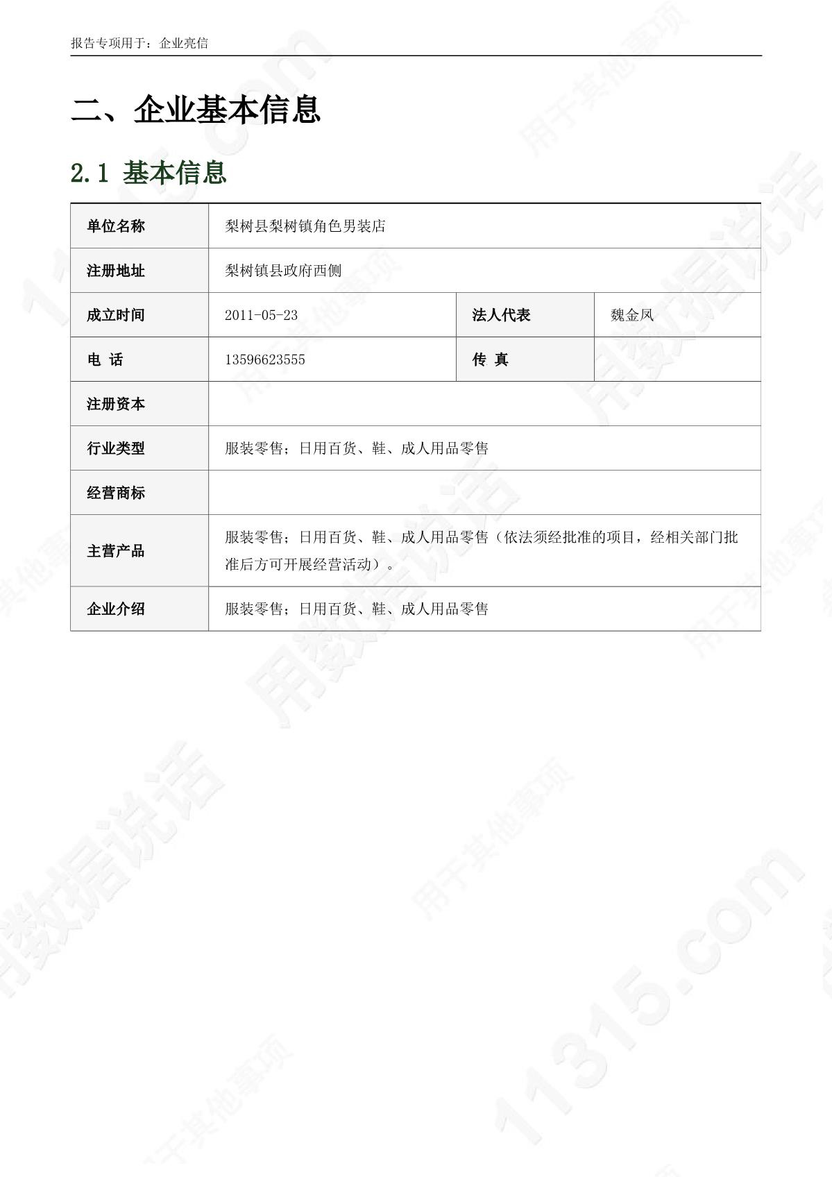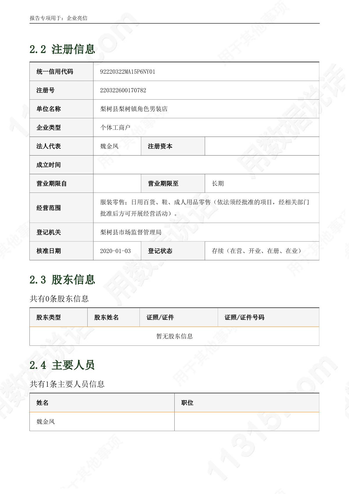 2、企业介绍:梨树县梨树镇角色男装店成立于2011-05-23,经营者为魏金凤,统一社会信用代码为92220322MA15P6NY01,企业地址位于梨树镇县政府西侧,所属行业为零售业,经营范围包含:服装零售;日用百货、鞋、成人用品零售(依法须经批准的项目,经相关部门批准后方可开展经营活动)。梨树县梨树镇角色男装店目前的经营状态为存续(在营、开业、在册)。