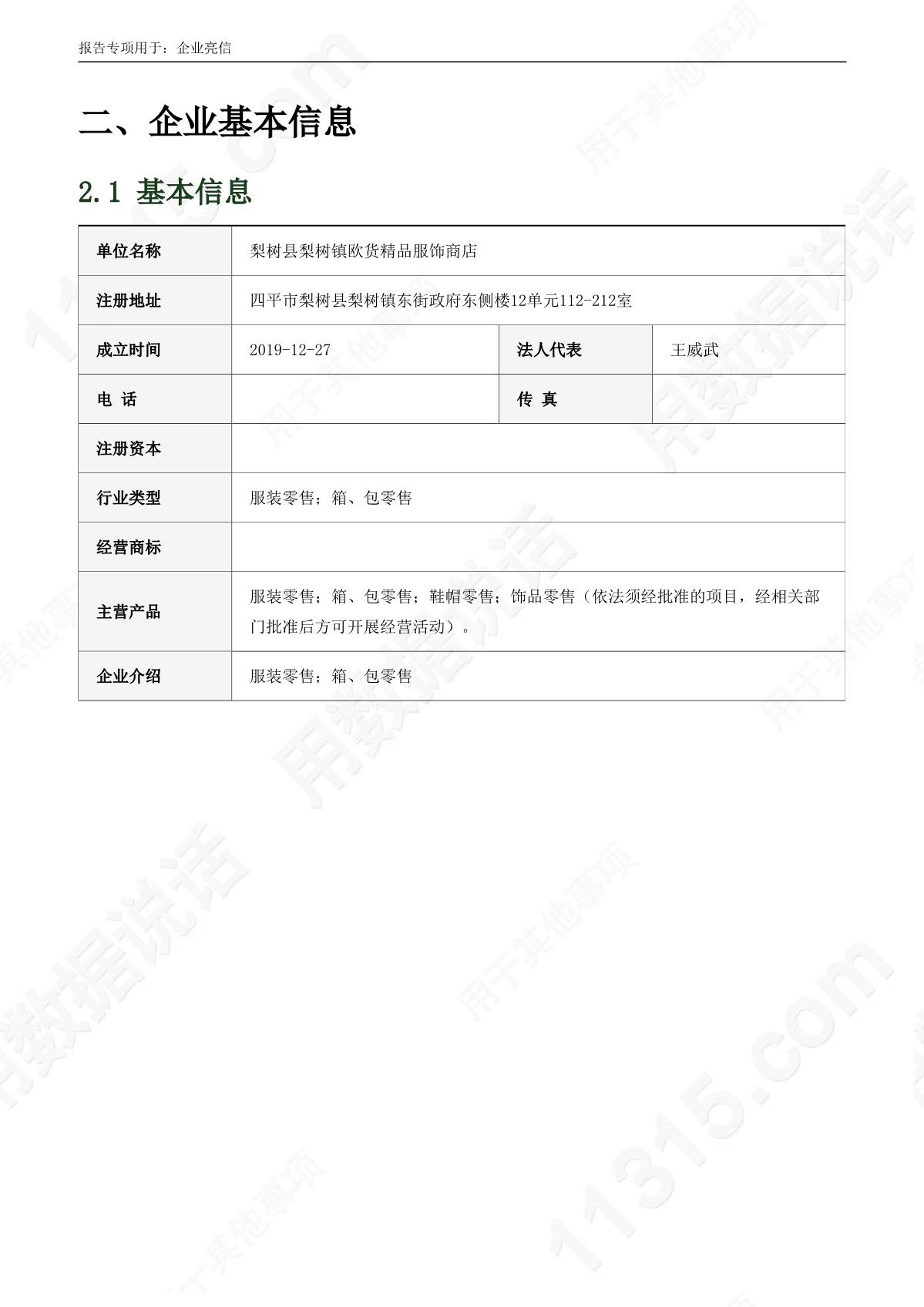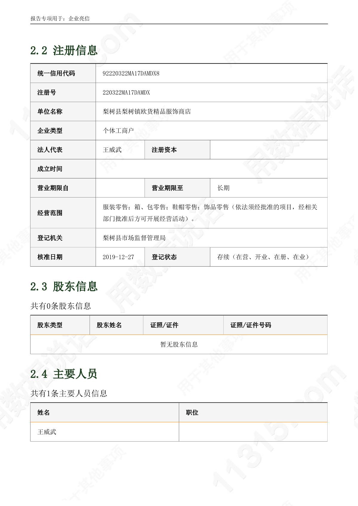 2、企业介绍:梨树县梨树镇欧货精品服饰商店成立于2019-12-27,经营者为王威武,统一社会信用代码为92220322MA17DAMDX8,企业地址位于四平市梨树县梨树镇东街政府东侧楼12单元112-212室,所属行业为零售业,经营范围包含:服装零售;箱、包零售;鞋帽零售;饰品零售(依法须经批准的项目,经相关部门批准后方可开展经营活动)。梨树县梨树镇欧货精品服饰商店目前的经营状态为注销。