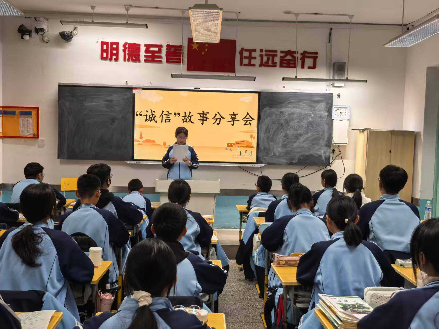 故事分享会上,学生们化身 “诚信宣讲员”,分享古今中外诚信典范故事。八年级学生讲述 “商鞅立木为信”“季布一诺千金” 的历史典故,九年级学生结合现代诚信人物事迹,分享 “快递小哥拾金不昧”“企业家坚守质量底线” 等现实案例。学生们纷纷表示,从故事中感受到诚信的力量,将以榜样为镜,坚守诚信底线。
